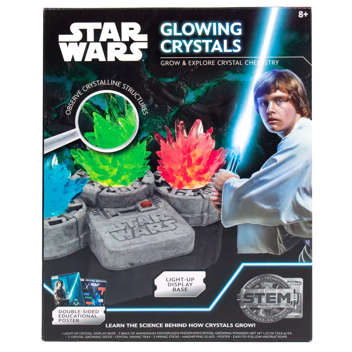 - The Star Wars Glowing Crystals kit includes everything they need, including crystal-growing seeds and powders, mixing sticks, a magnifying glass and step-by-step instructions plus a double-sided poster filled with fun crystal facts. However, your youngster will have to choose which side they’re on: the dark or the light side.